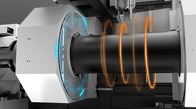 重型全行程氣動(dòng)卡盤,無(wú)需更換卡爪;八缸夾持,夾持力是普通卡盤的 兩倍;三款側(cè)掛式重型卡盤,運(yùn)行更穩(wěn)定 聯(lián)合多組全行程伺服支撐,對(duì)重管進(jìn)行多方位托舉 承重力強(qiáng);包容性強(qiáng),可批量加工16-520mm的管材